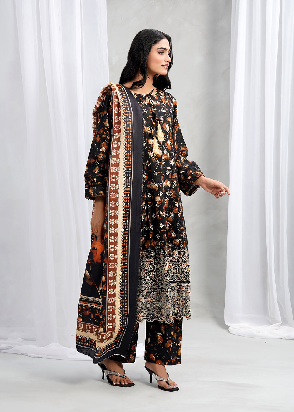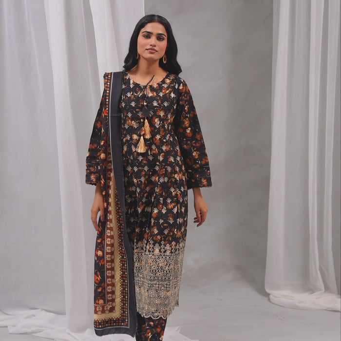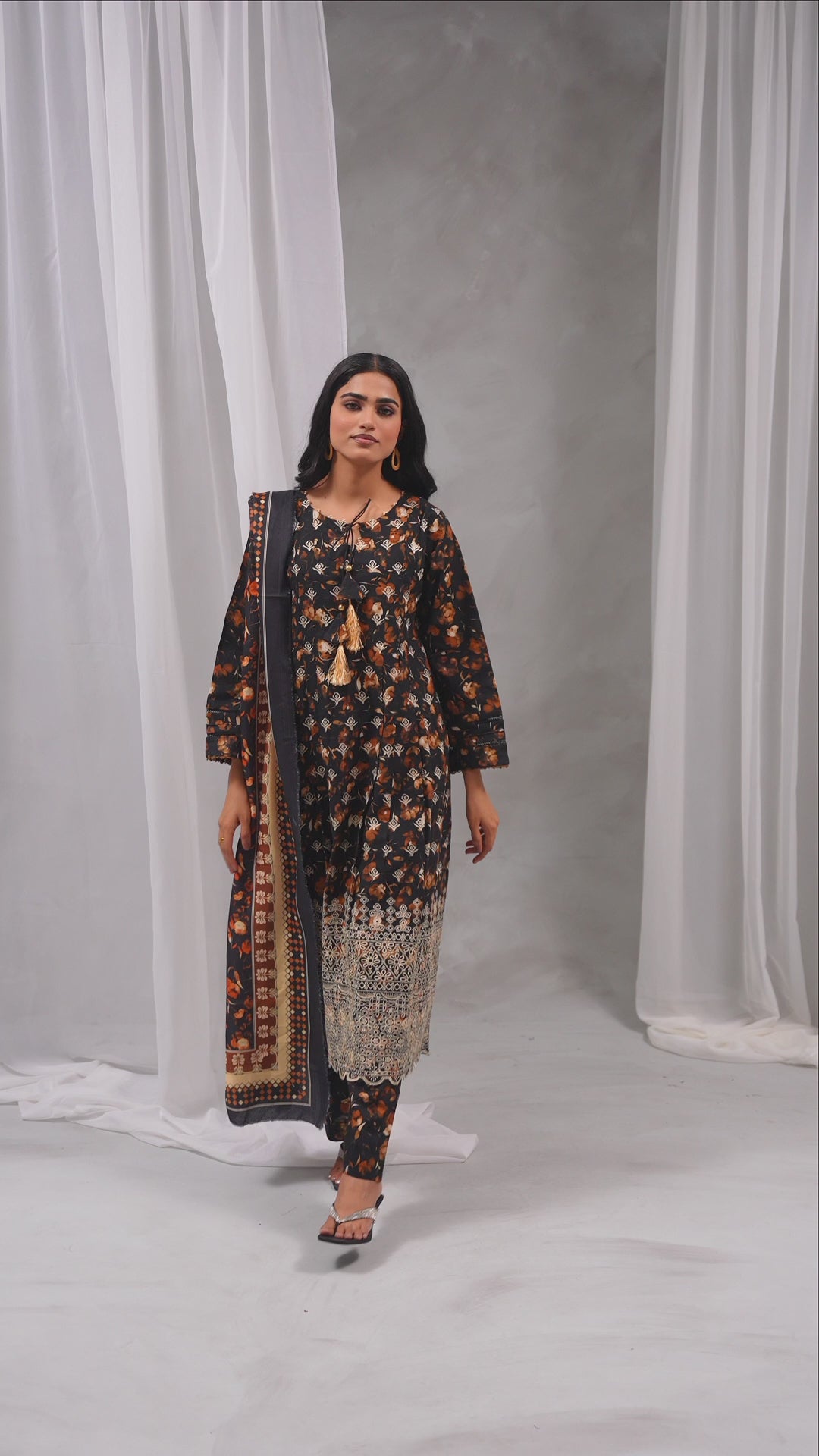 Description: 3-piece embroidered long frock-style printed kotari suit featuring elegant embroidery and subtle cutwork detailing. The rich black base with autumn floral prints adds a warm seasonal touch. Comes with a matching printed dupatta and trousers — perfect for a graceful and trendy winter look..
