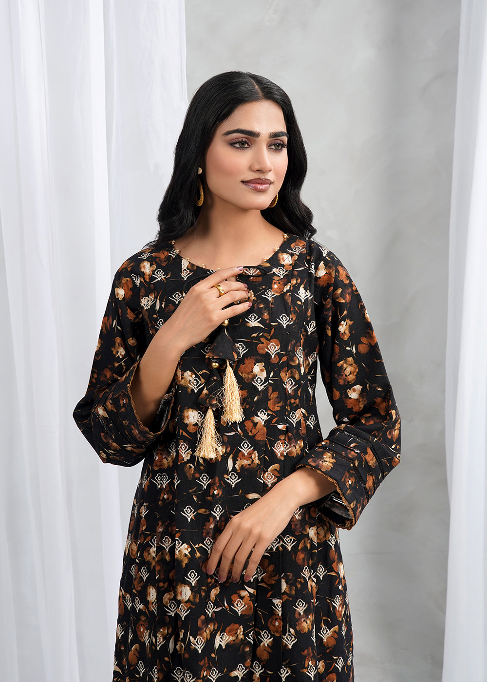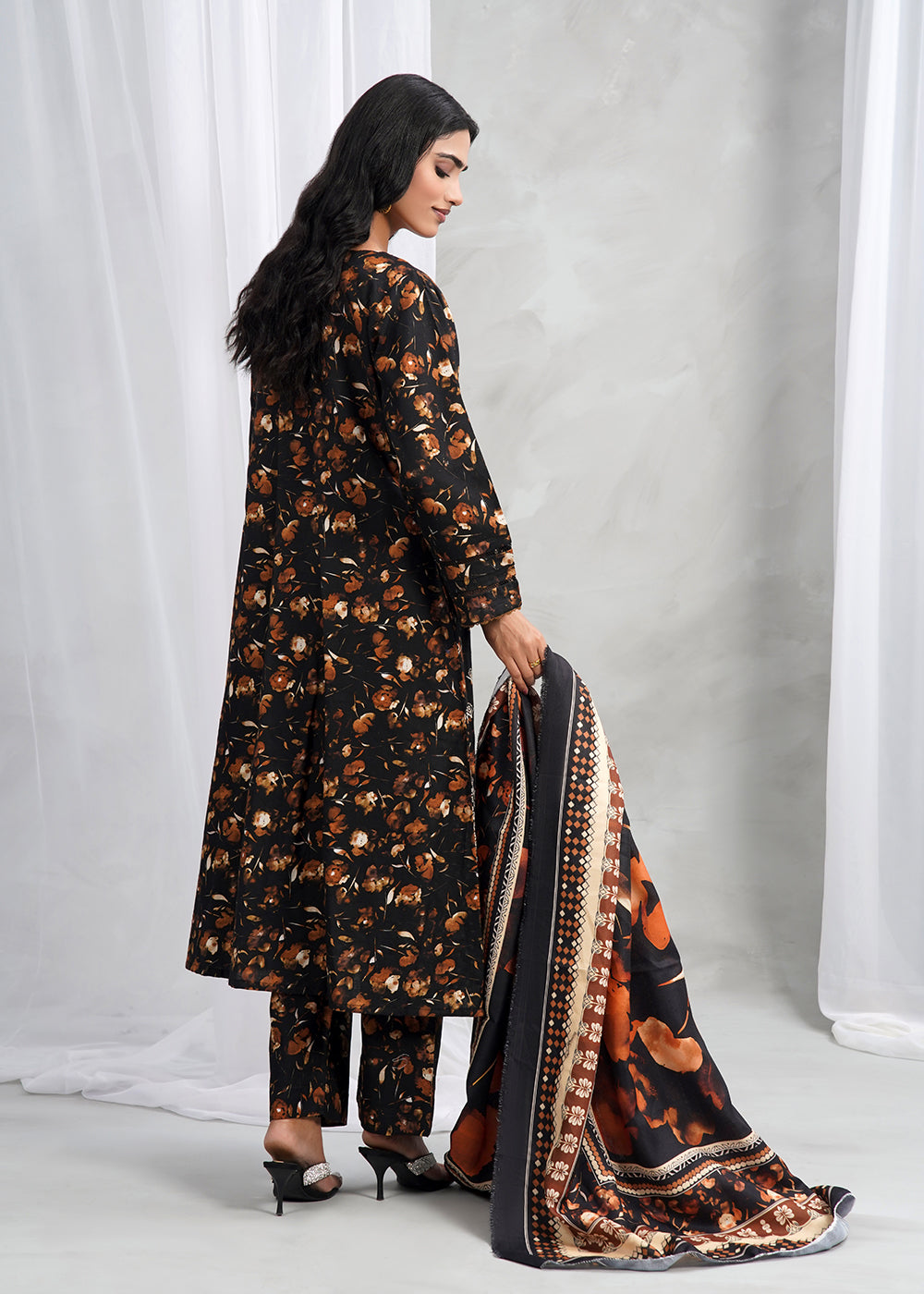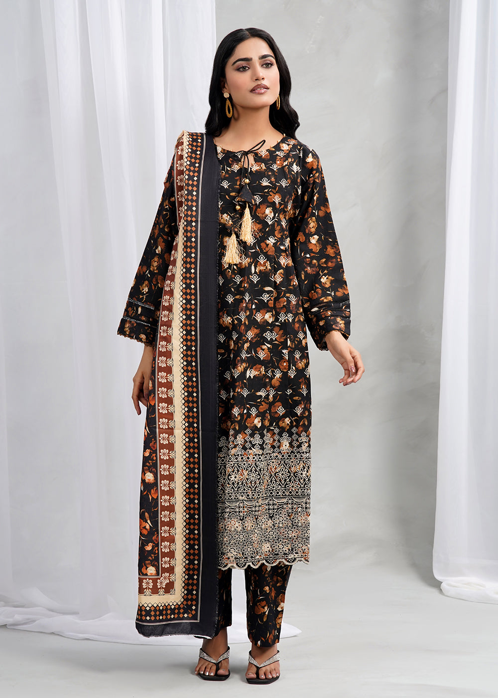 Description: 3-piece embroidered long frock-style printed kotari suit featuring elegant embroidery and subtle cutwork detailing. The rich black base with autumn floral prints adds a warm seasonal touch. Comes with a matching printed dupatta and trousers — perfect for a graceful and trendy winter look..