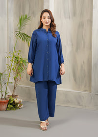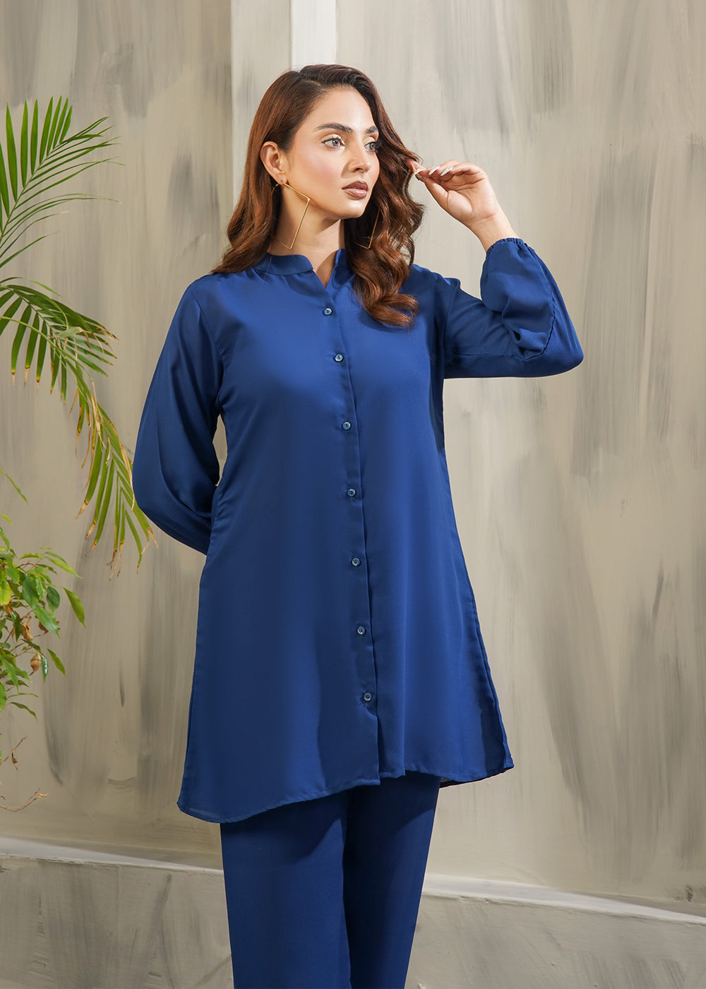 A stylish two-piece outfit featuring a button-down long shirt with a band collar and full sleeves finished with elastic cuffs. The shirt has a relaxed cut for an elegant drape, paired with straight-fit trousers. A graceful and versatile set, perfect for both casual and semi-formal occasions.