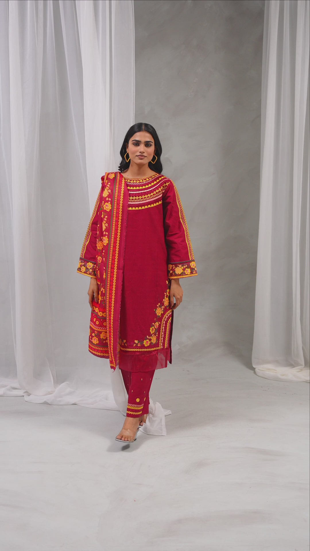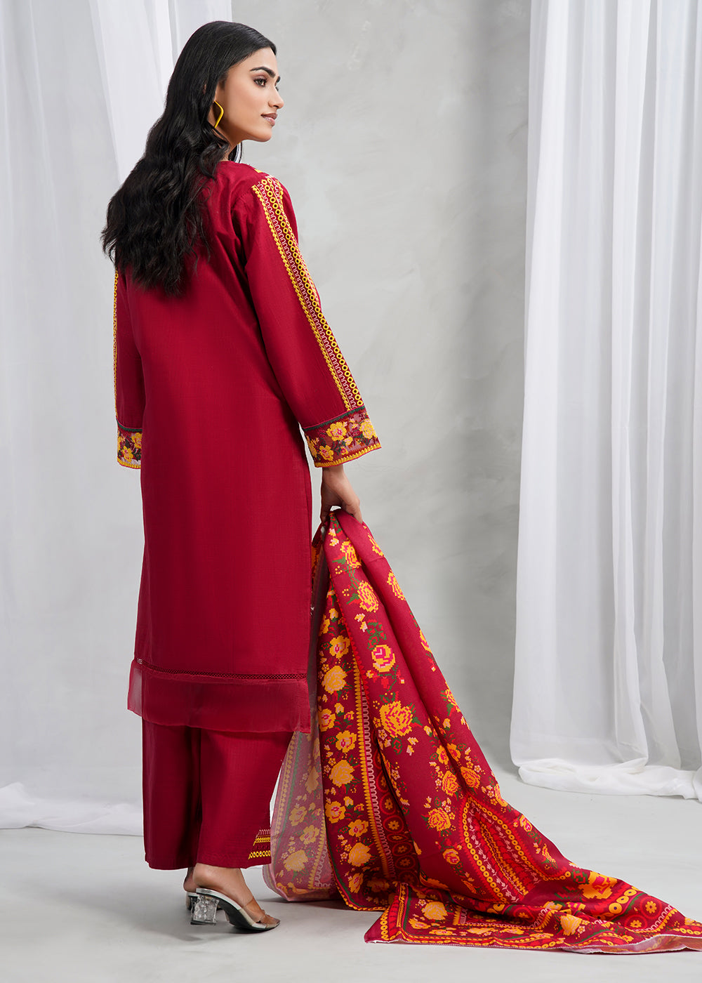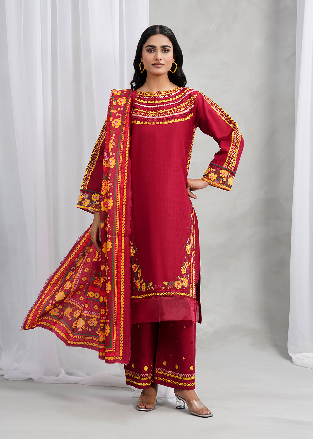 Description: 3-piece embroidered khaddar suit featuring elegant floral embroidery and cutwork detailing. The beautifully crafted shirt is paired with matching trousers and a vibrant printed dupatta that enhances the warmth of the maroon tone — perfect for adding festive elegance to your winter wardrobe.