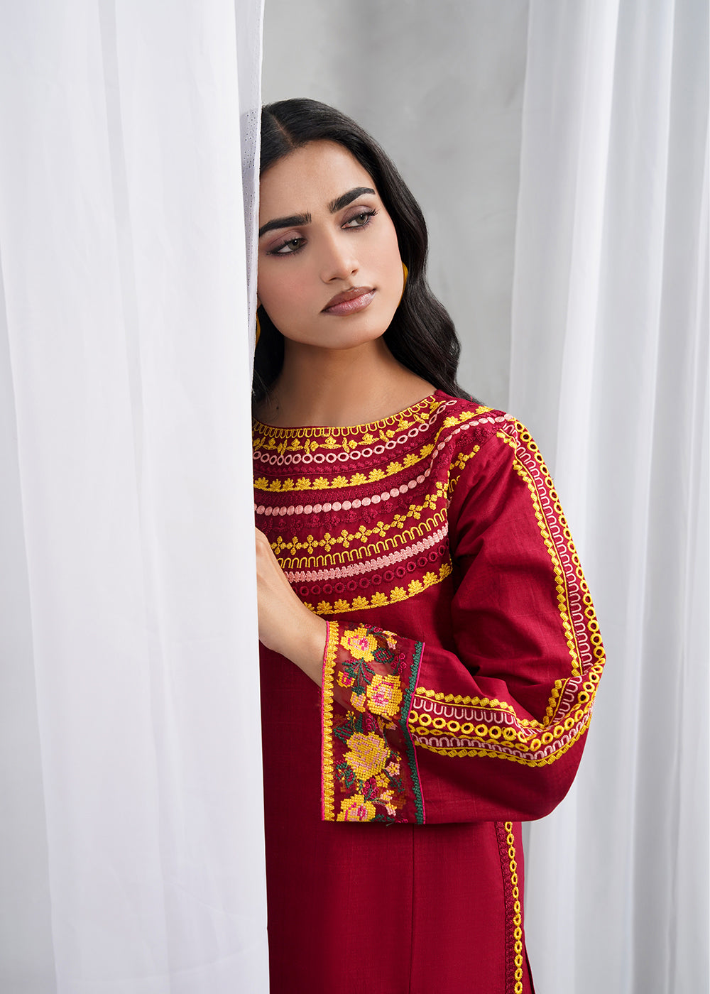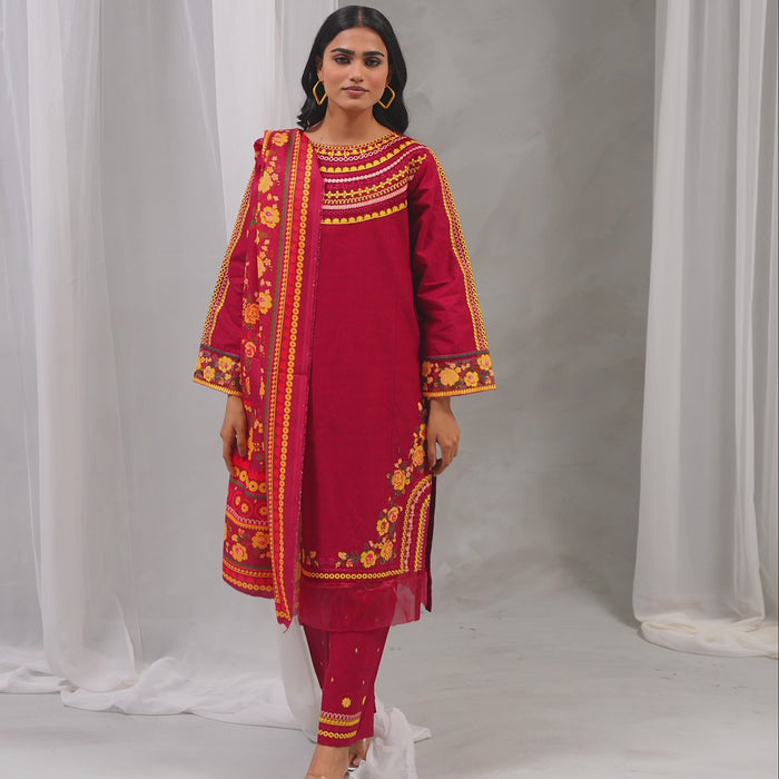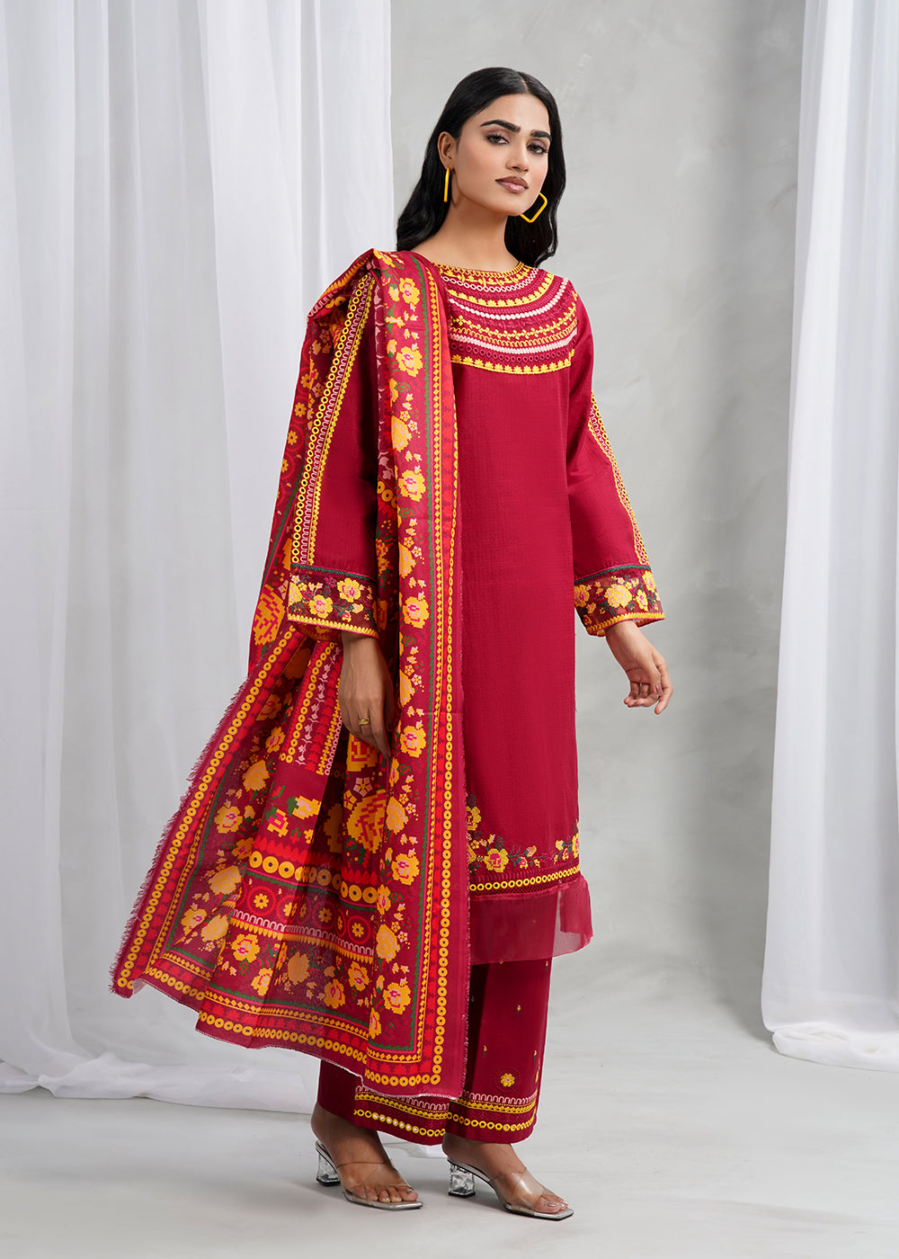 Description: 3-piece embroidered khaddar suit featuring elegant floral embroidery and cutwork detailing. The beautifully crafted shirt is paired with matching trousers and a vibrant printed dupatta that enhances the warmth of the maroon tone — perfect for adding festive elegance to your winter wardrobe.