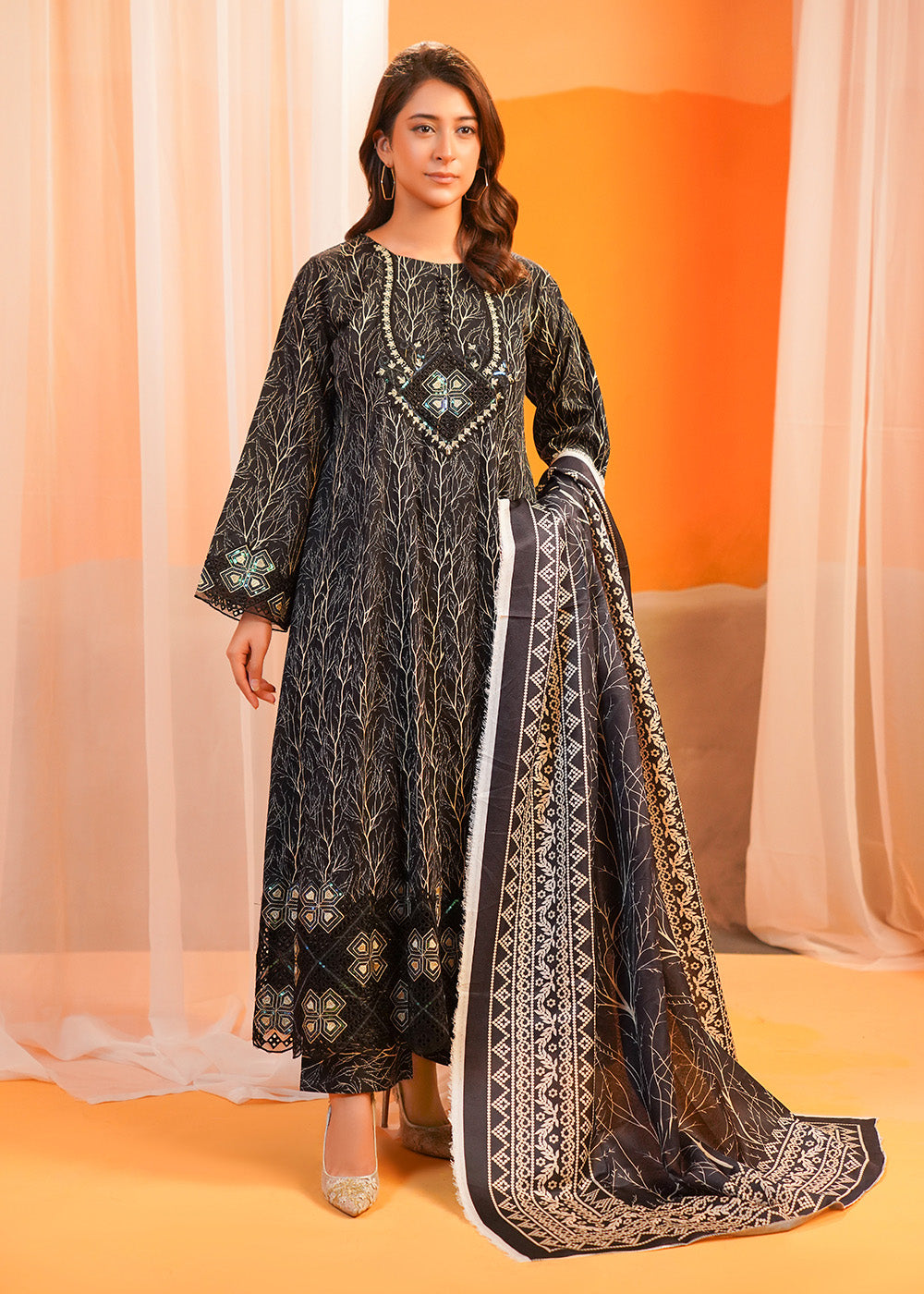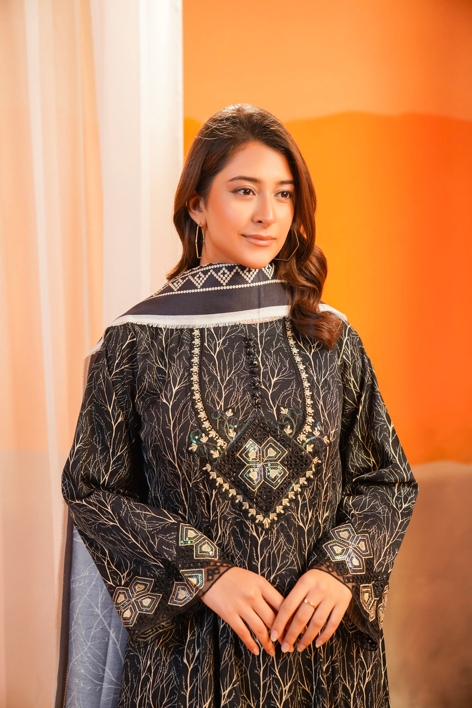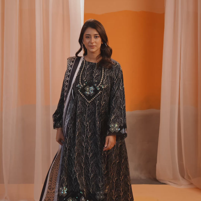 Elegant 3-piece long maxi in timeless black and white floral print. Styled with a printed shawl and delicately embroidered neckline border, this outfit blends classic charm with modern grace.
