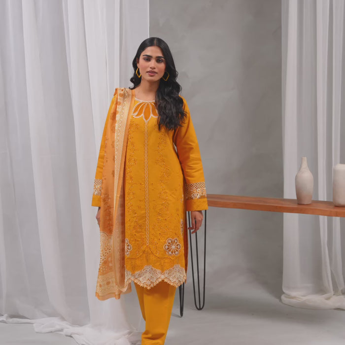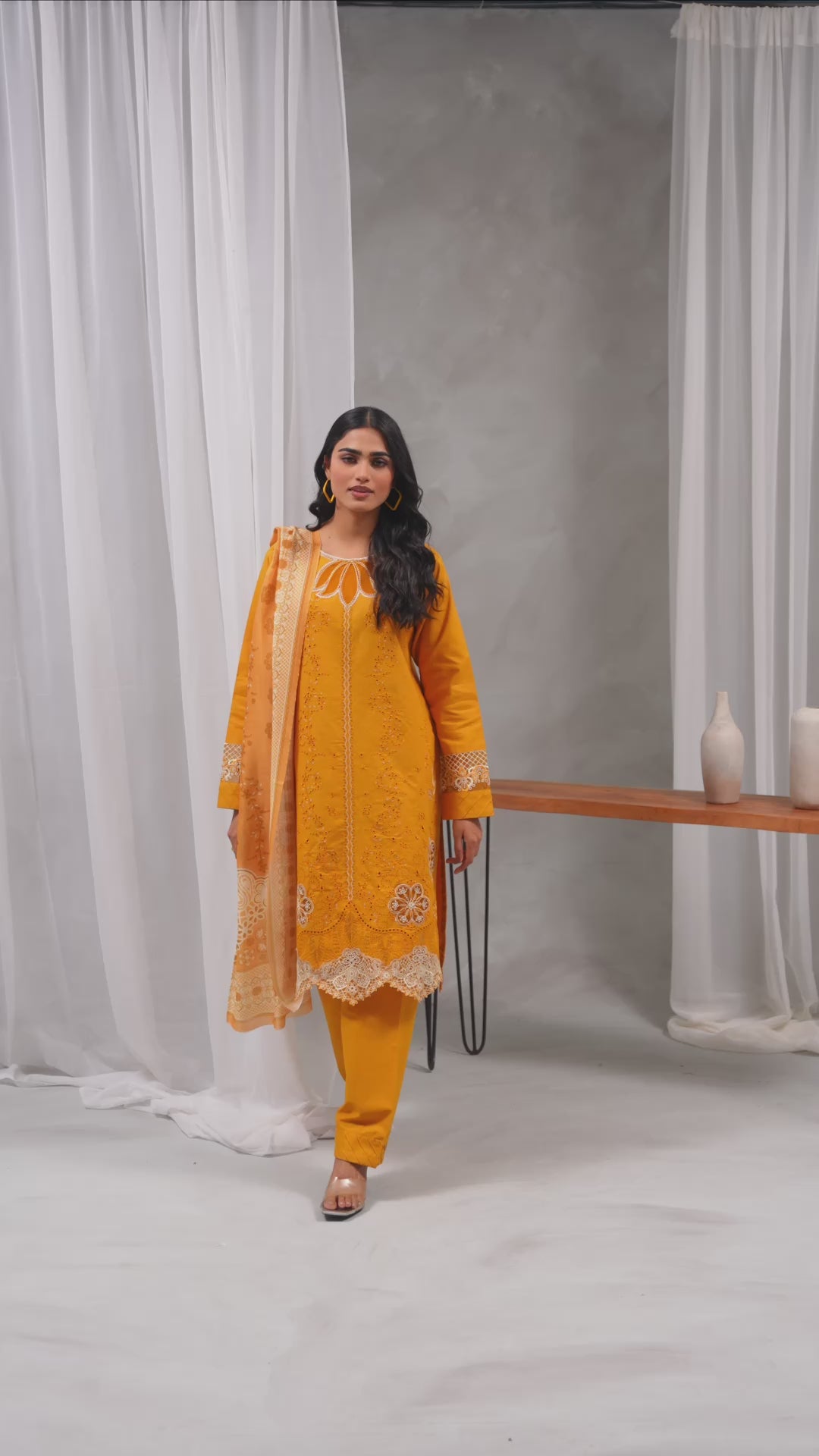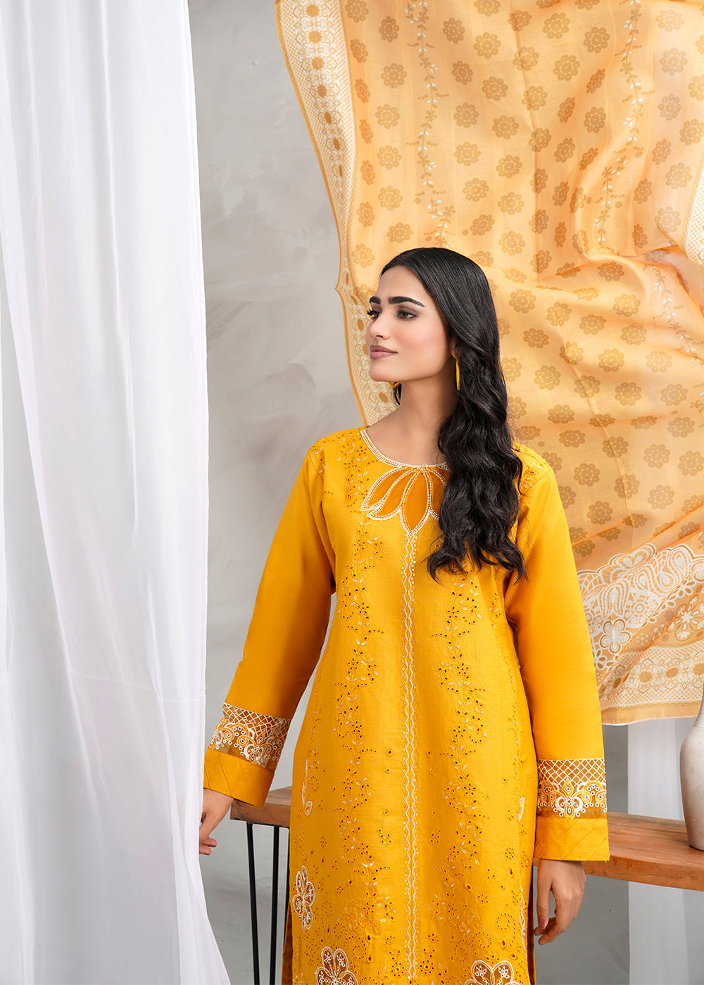 Description: 3-piece embroidered khaddar suit featuring delicate cutwork details. The shirt showcases intricate embroidery with lace accents on the hem and sleeves, paired with matching plain trousers. Comes with a beautifully printed dupatta that complements the vibrant mustard tone — perfect for winter elegance.
