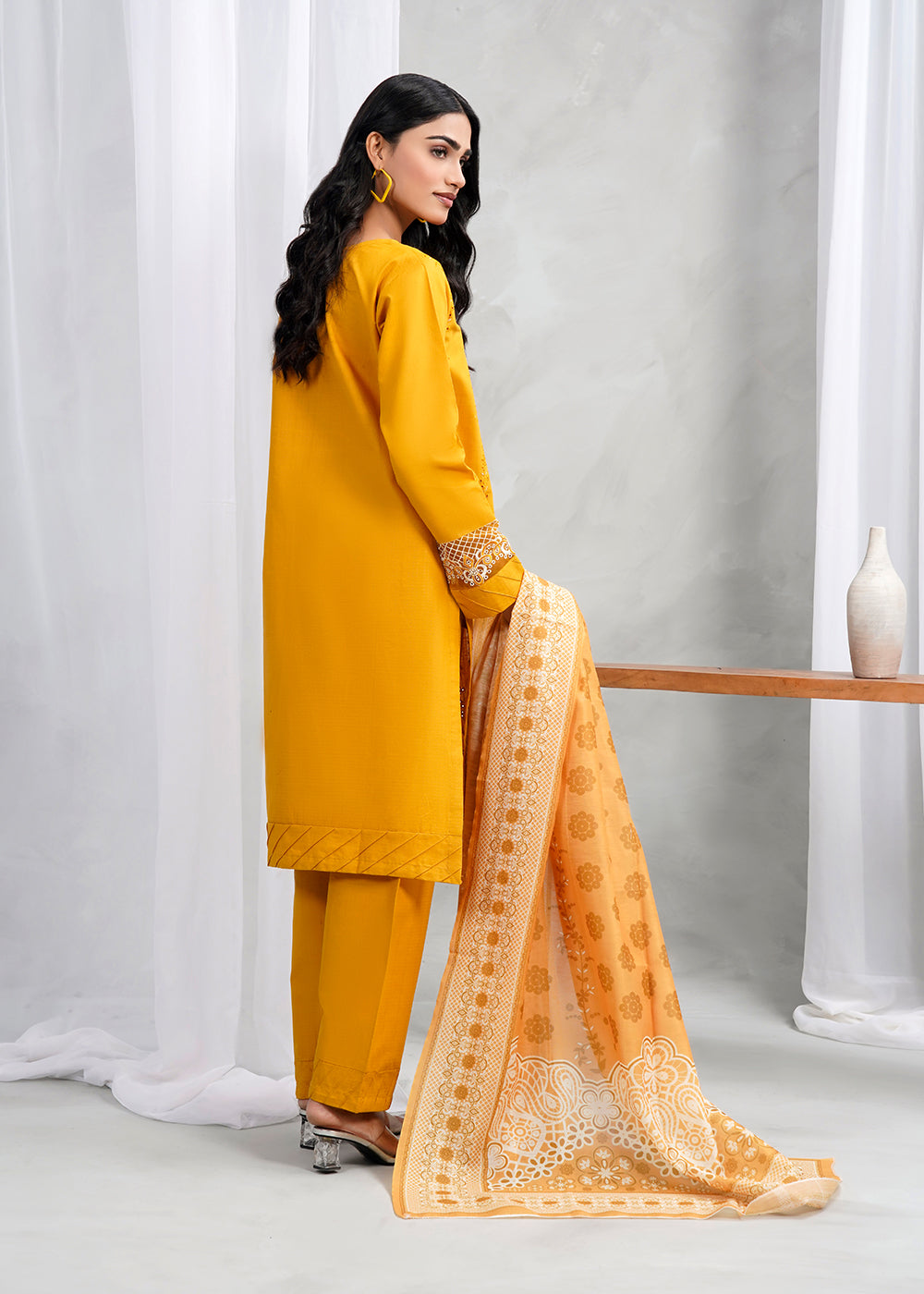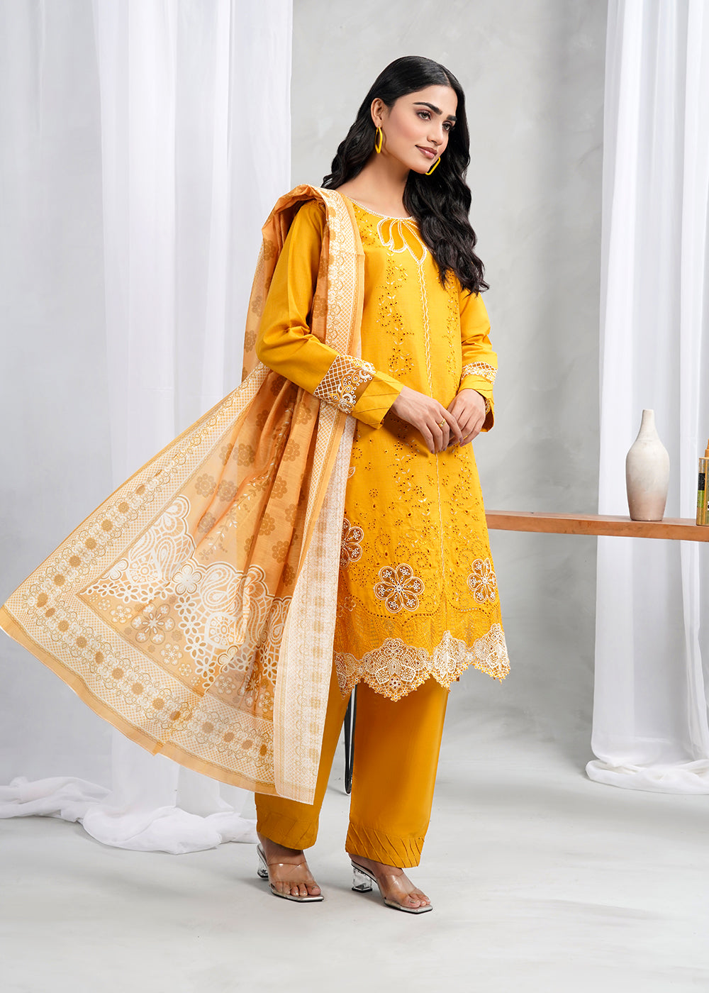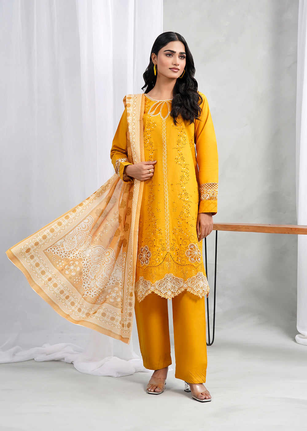Description: 3-piece embroidered khaddar suit featuring delicate cutwork details. The shirt showcases intricate embroidery with lace accents on the hem and sleeves, paired with matching plain trousers. Comes with a beautifully printed dupatta that complements the vibrant mustard tone — perfect for winter elegance.