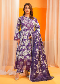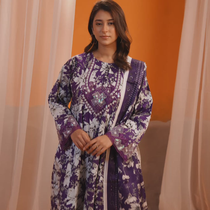 Stylish 3-piece long maxi with elegant floral prints in purple and white tones. Paired with a matching printed shawl and finished with embroidered neckline border detailing for a graceful festive look.